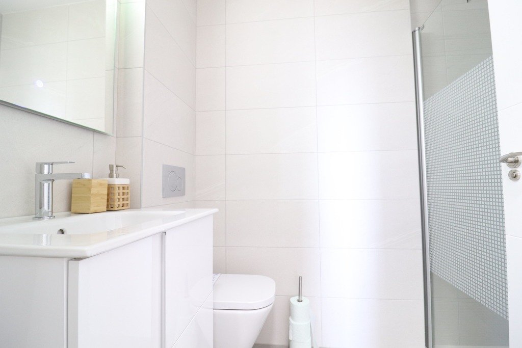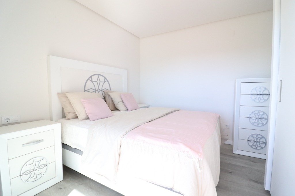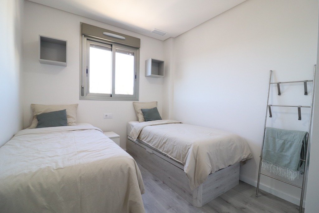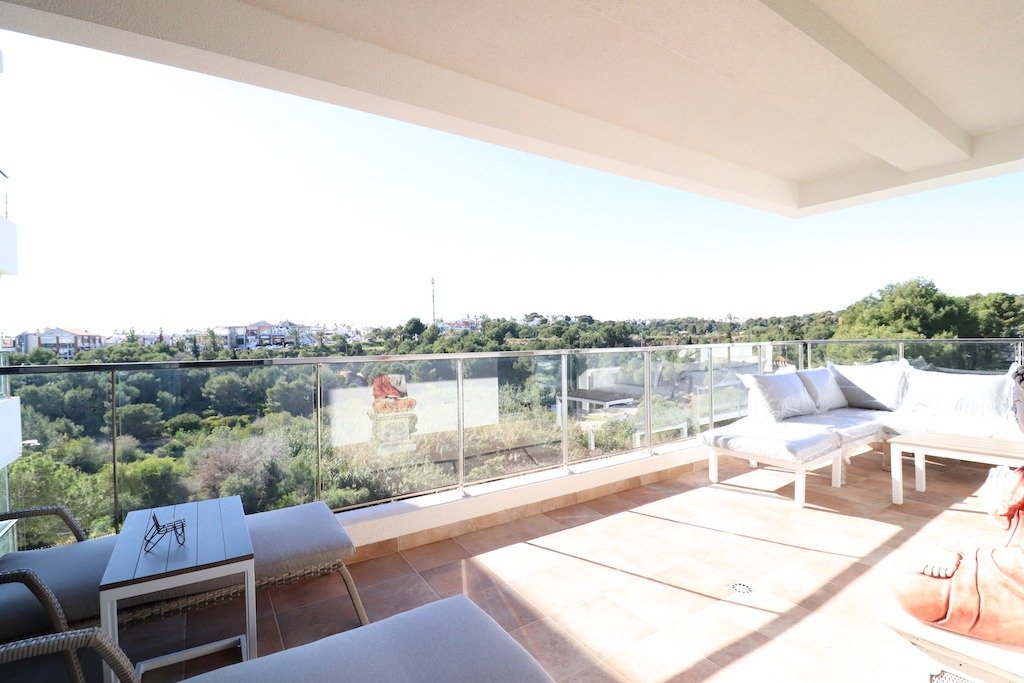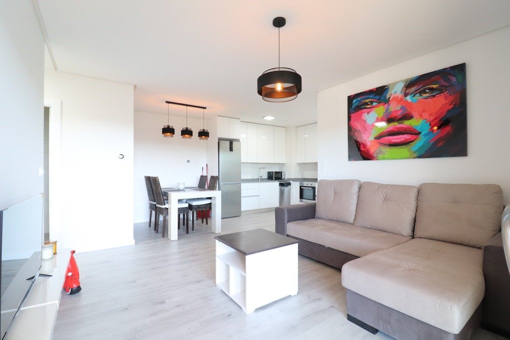 Long term rental. New luxury apartment in La Zenia, “Green Hills” residential area. Third floor with elevator, apartment with 3 bedrooms and 2 bathrooms (1 en suite), large living room with dining area and open kitchen. 12 m2 glazed “curtain” terrace, south-west facing. Apartment fully furnished and equipped with appliances and utensils. Accommodation capacity up to 6 people. Central air conditioning/heating, Wi-Fi, International TV with 1.500 channels. Parking space in the underground garage. Residential has large common areas with 3 swimming pools: Olympic, for relaxation and SPA with sauna, there is also a gym, playground, ping-pong tables. Close to all services and Zenia Boulevard shopping center. Distance to the beach 2 km.~~~